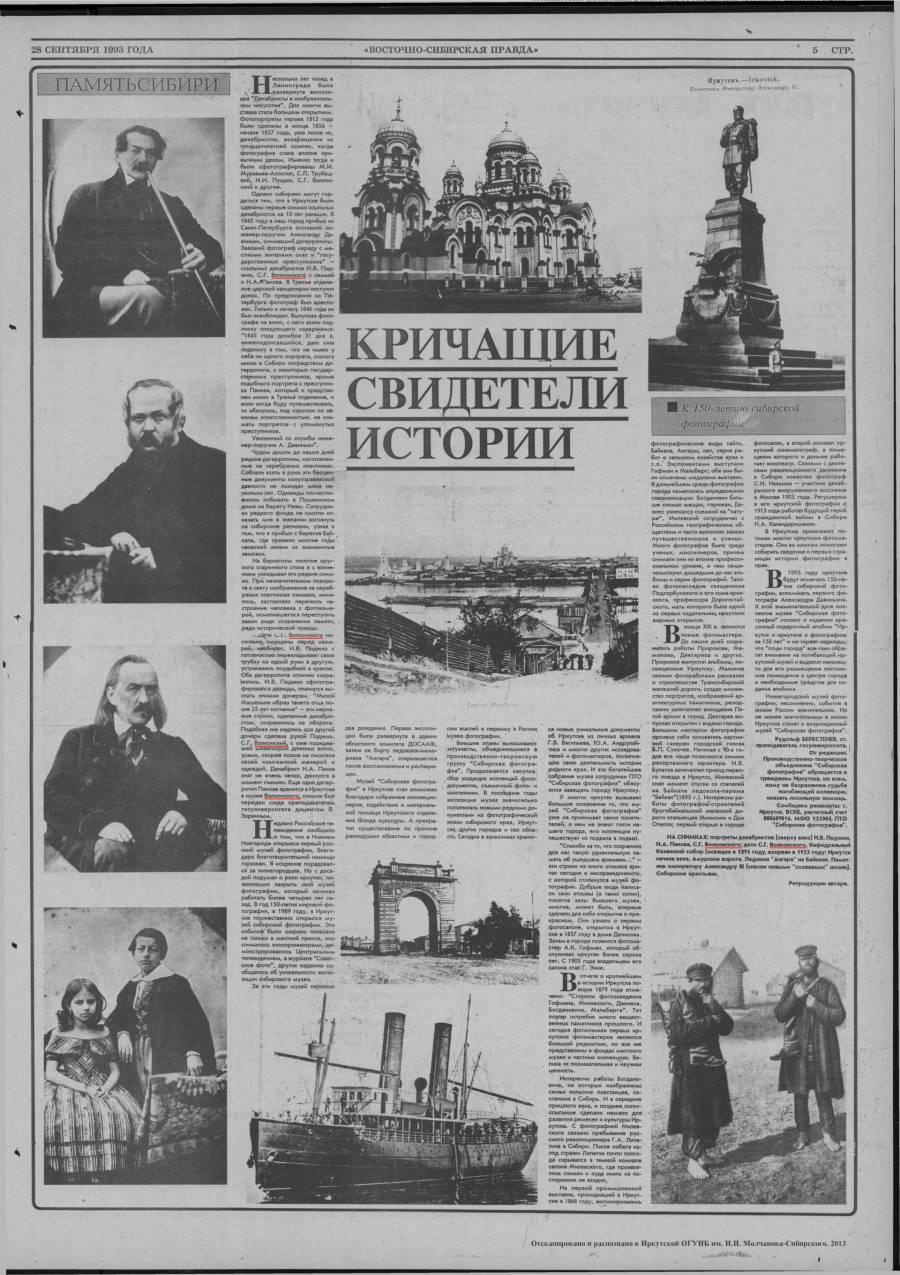 Особого внимания заслуживает публикация в газете «Восточно-Сибирская правда» от 28 сентября 1993 года. В рубрике «Память Сибири» была напечатана статья Рудольфа Берестенева, старшего преподавателя Иркутского государственного университета, под названием «Кричащие свидетели истории». В ней сообщается о приезде в Иркутск в 1845 году отставного инженера-поручика Александра Давиньона, который занимался дагерротипией. Наряду со съемкой местных жителей, фотограф запечатлел государственных преступников — ссыльных декабристов: И.В. Поджио, С.Г. Волконского с семьей и Н.А. Панова. На него поступил донос в Третье отделение царской канцелярии. По предписанию из Петербурга Давиньон был арестован и освобожден лишь к началу 1846 года. При освобождении с него взяли подписку следующего содержания: «1845 года декабря 31 дня, я, нижеподписавшийся, даю сию подписку в том, что не имею у себя ни одного портрета снятого мною в Сибири посредством дагерротипа с некоторых государственных преступников, кроме подобного портрета с преступника Панова, который и представлен мною в Третье отделение, и если, когда буду путешествовать, то обязуюсь, под строгою по законам ответственностью, не снимать портретов с упомянутых преступников. Уволенный со службы инженер-поручик А. Давиньон».