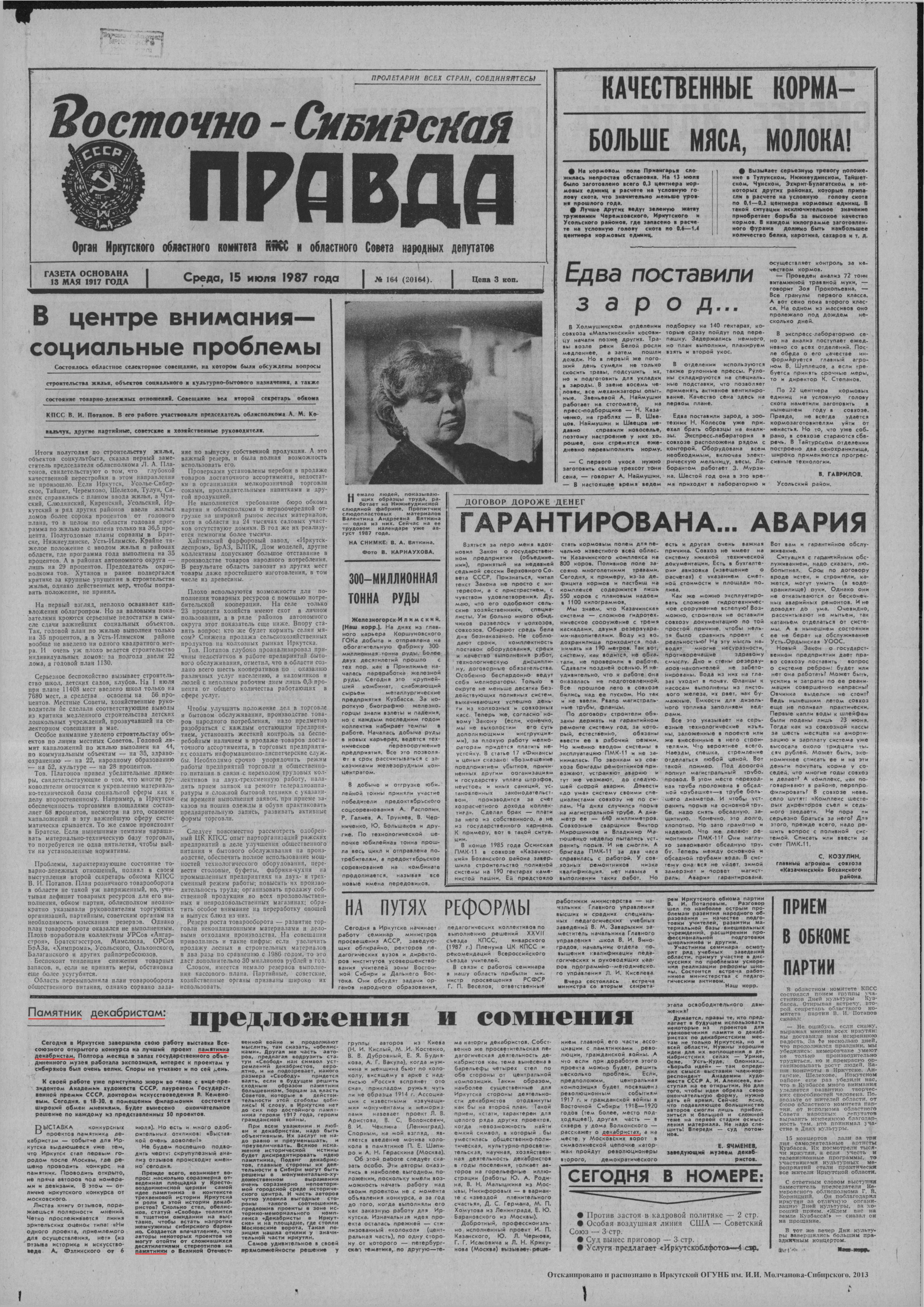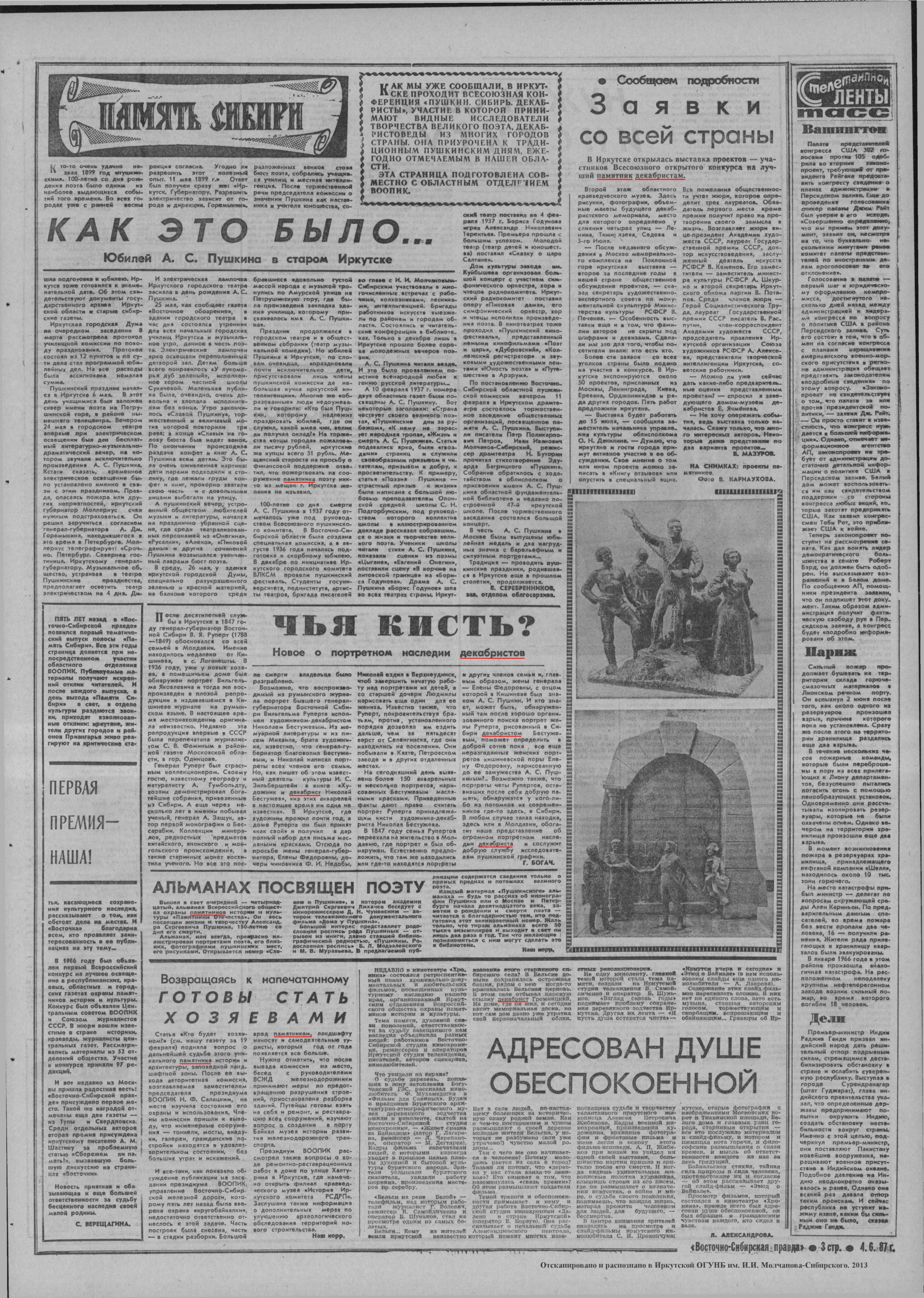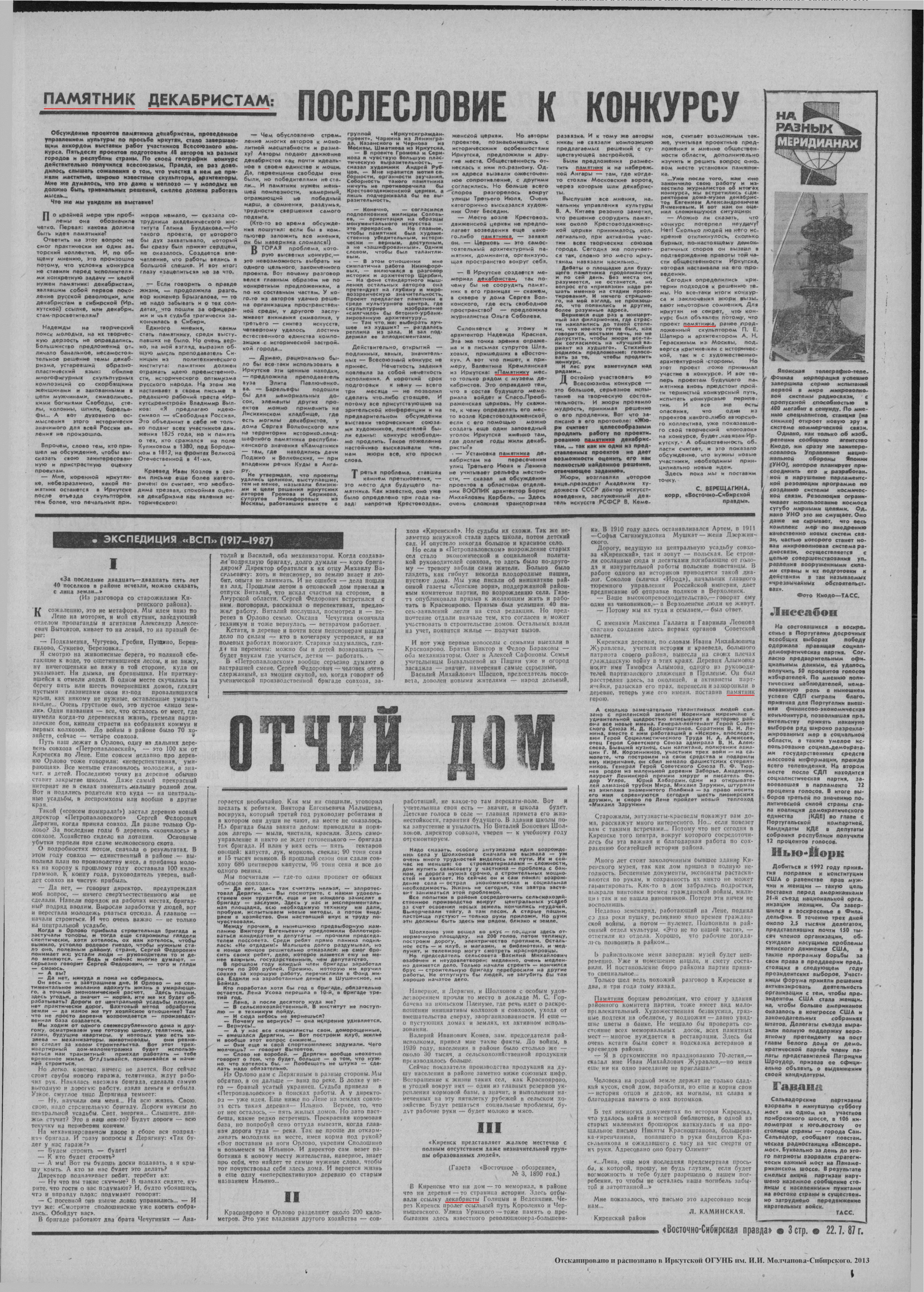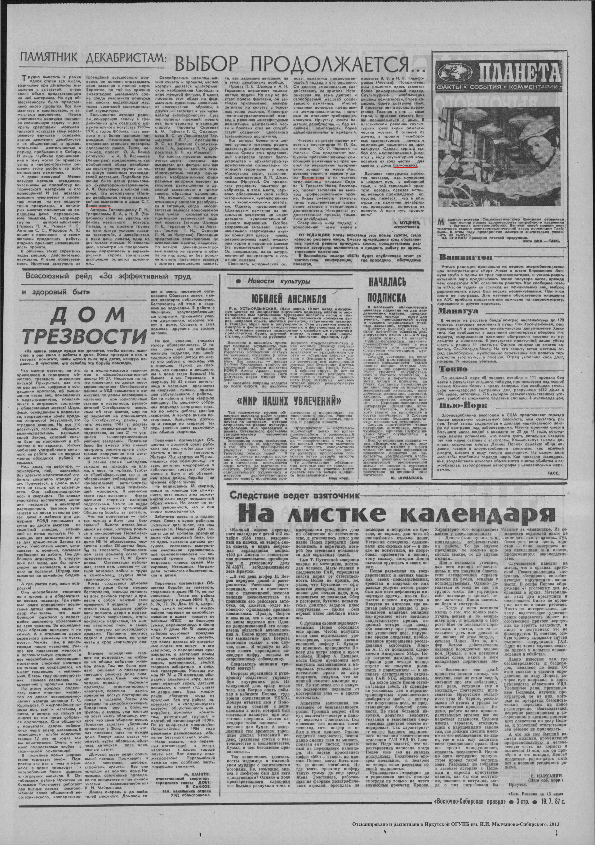 В 1987 году газета «Восточно-Сибирская Правда» и другие газеты посвятили ряд публикаций декабристской тематике. Центральное место в обсуждениях занял конкурс на проект памятника декабристам.