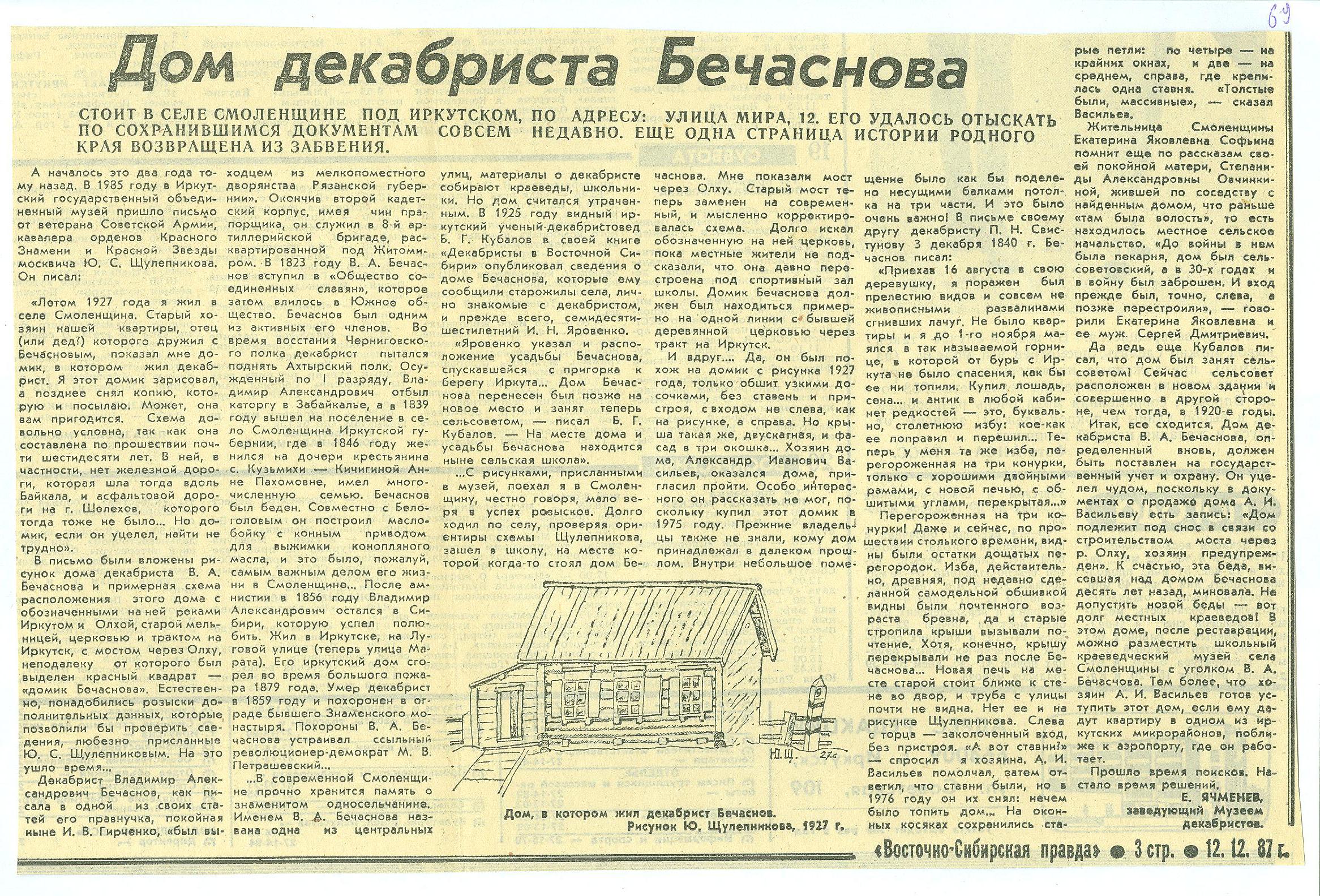 Еще одним заметным событием стала публикация Е. Ячменева, сообщившего о находке дома декабриста В.А. Бечаснова в селе Смоленщина.