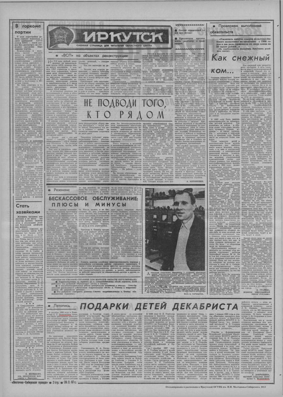 Помимо этого, в прессе появлялись материалы, посвященные наследию декабриста Николая Бестужева. Читателям рассказывали о его творчестве и о ценных буддийских предметах, которые его дети — Екатерина Старцева-Гомбоева и Алексей Старцев — передали в музей ВСОРГО.