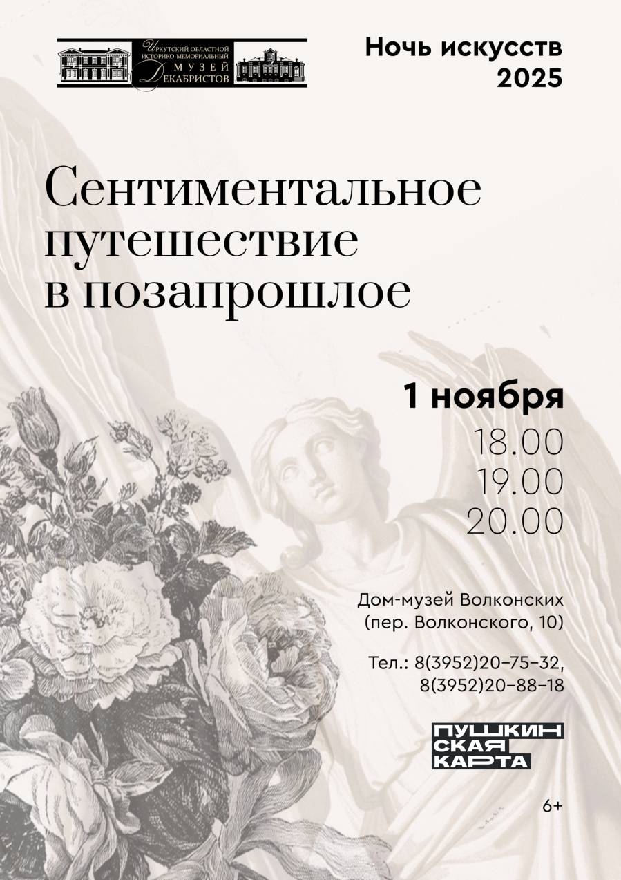 1 ноября с 18.00 Иркутский музей декабристов приглашает в Дом-музей Волконских (пер. Волконского, 10) на интерактивную программу «Сентиментальное путешествие в позапрошлое» в рамках Всероссийской акции «Ночь искусств-2025».