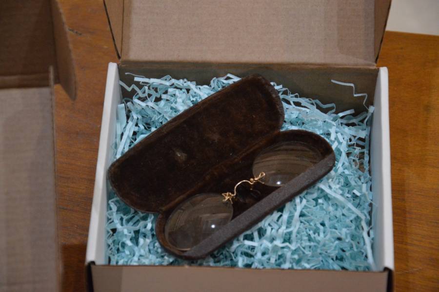 Новым экспонатом стало пенсне начала XX века в оригинальном металлическом футляре. История его приобретения напоминает увлекательное приключение. Летом этого года Любовь Подшивалова отправилась на знаменитый питерский блошиный рынок «Уделка». Как рассказывает дарительница, им с попутчиками повезло: день был небазарный, и на рынке было немноголюдно, что позволило неспешно общаться с продавцами и внимательно изучать вещи.