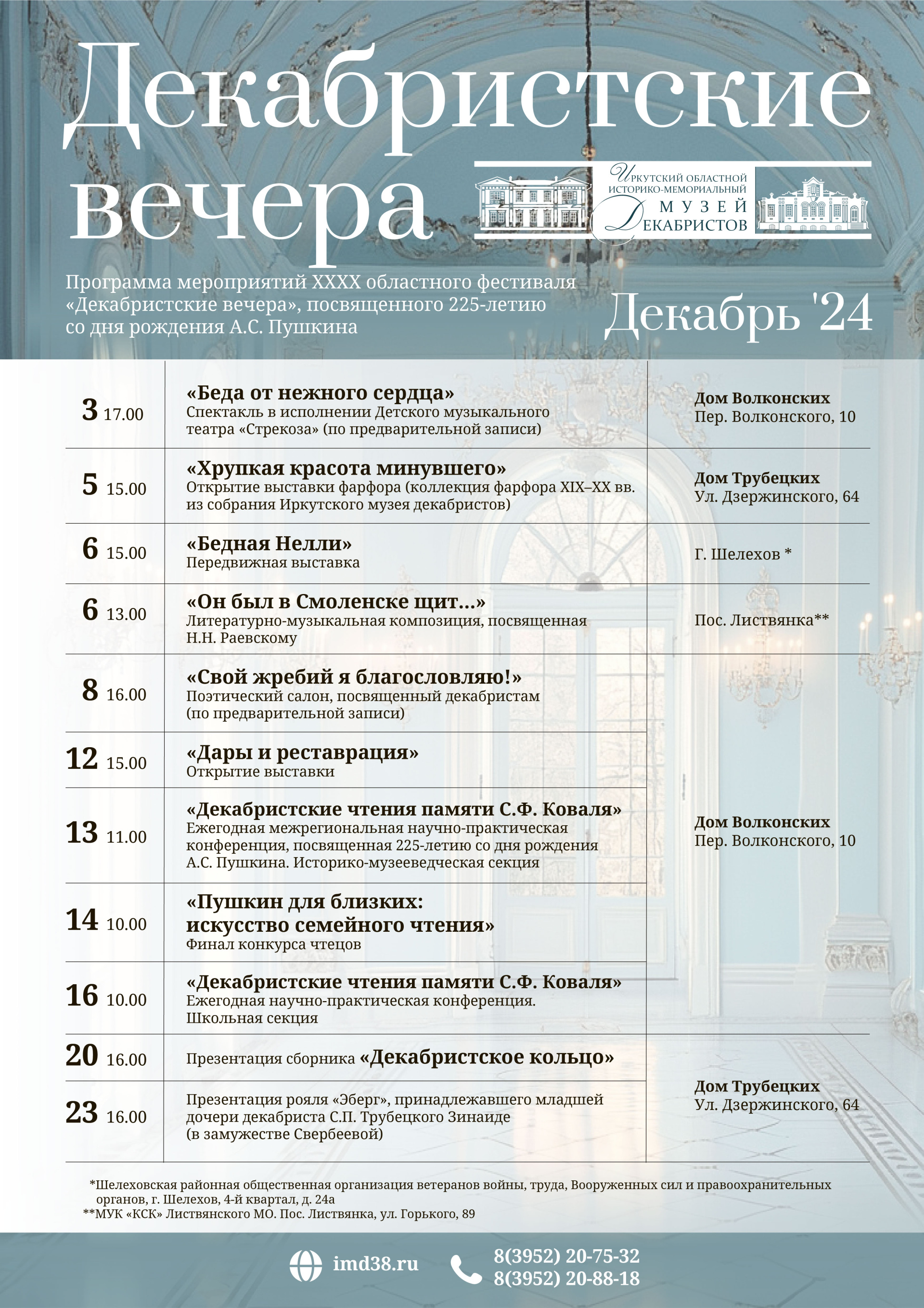 На все мероприятия фестиваля, проводимые в Иркутском музее декабристов, вход свободный. Приглашаем иркутян и гостей города. Подробная информация в афише фестиваля.